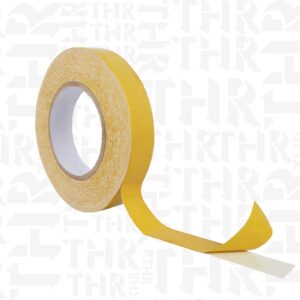 Fita dupla face com dorso de tecido, adesivo à base de borracha e resina e com liner de papel amarelo siliconizado.